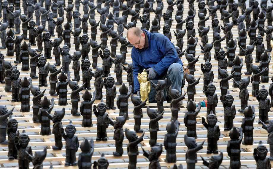 10月14日,德國施特勞賓市街頭擺放了1250個行納粹禮的花園土地神像,“行納粹禮的花園土地神”其實是一款雕塑作品,是由59歲的德國藝術(shù)家奧特馬爾·赫勒爾創(chuàng)作的目的在于提醒人們警惕法西斯思想,反對使用法西斯思想控制大眾。