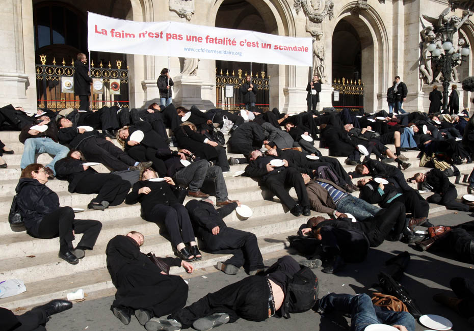 10月15日,示威者身穿黑色衣服、手持空盤子在巴黎歌劇院前抗議。他們此舉是為了呼吁人們關(guān)注世界上的饑民。圖片來源:中國新聞網(wǎng)