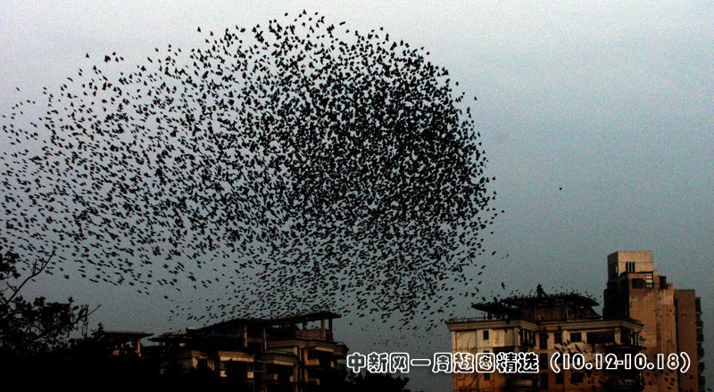 10月16日傍晚,近萬(wàn)只椋鳥(niǎo)在湖北省武漢動(dòng)物園樹(shù)林上空及旁邊居民小區(qū)旁飛翔,嘰嘰喳喳,熱鬧非凡,場(chǎng)面蔚為壯觀。圖片來(lái)源:CFP