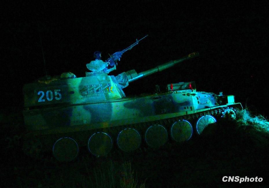 當(dāng)晚國防大學(xué)防務(wù)學(xué)院、空軍指揮學(xué)院的外軍學(xué)員,以及英國、以色列、土耳其、巴基斯坦等國軍事觀察員親臨現(xiàn)場觀摩了后勤保障戰(zhàn)斗準(zhǔn)備、自行榴彈炮占領(lǐng)陣地、裝甲車輛“摸黑”開進(jìn)等戰(zhàn)斗要素。圖為摸黑”開進(jìn)的裝甲戰(zhàn)車進(jìn)入戰(zhàn)位。中新社發(fā) 宋吉河 攝