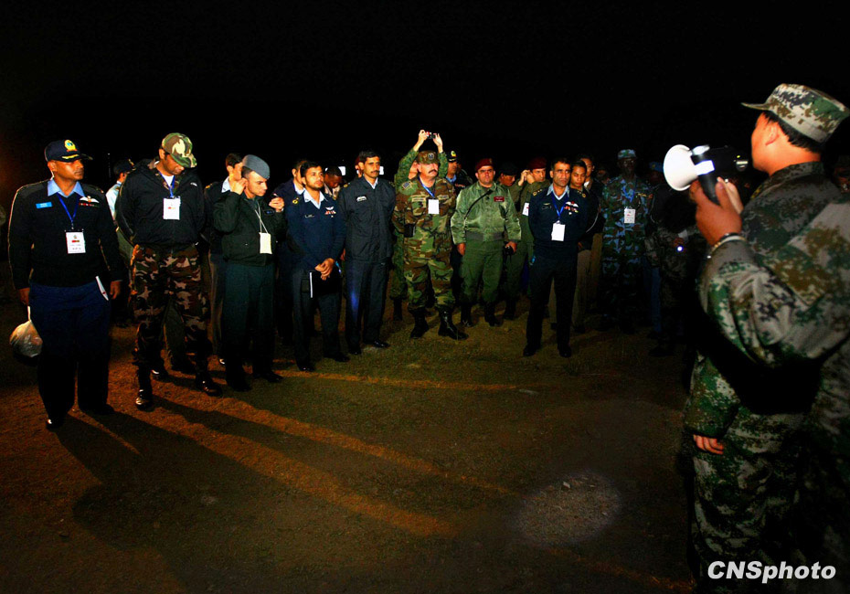 當晚國防大學防務學院、空軍指揮學院的外軍學員,以及英國、以色列、土耳其、巴基斯坦等國軍事觀察員親臨現(xiàn)場觀摩了后勤保障戰(zhàn)斗準備、自行榴彈炮占領陣地、裝甲車輛“摸黑”開進等戰(zhàn)斗要素。圖為參觀后勤保障基地。中新社發(fā) 宋吉河 攝