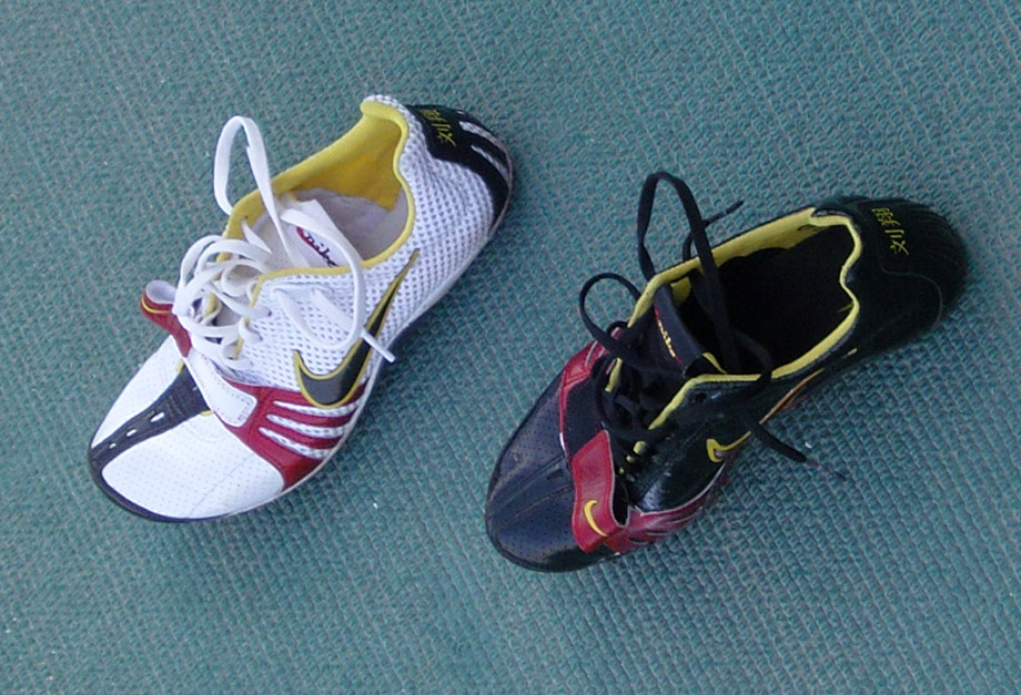 劉翔今天穿了一雙印有他名字的釘鞋,他左腳穿的是白色的新鞋,右腳的黑鞋是相對(duì)軟一些、舒適一些的的舊鞋,有利于保護(hù)他的傷腳。中新網(wǎng)記者 翁陽(yáng) 攝