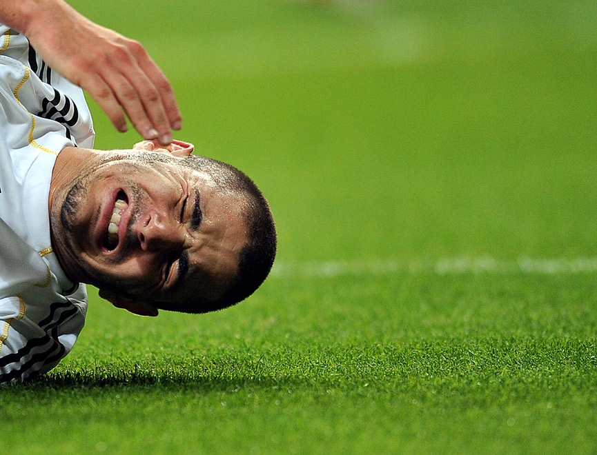 周四(22日)伯納烏體育場,皇馬前鋒本澤馬痛苦倒地。歐洲冠軍聯(lián)賽C組焦點戰(zhàn),皇馬在伯納烏球場迎戰(zhàn)AC米蘭隊,皇馬以2比3告負。 來源:中國新聞網(wǎng)