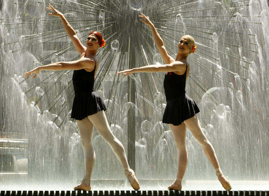 2009年10月23日,澳大利亞悉尼,來自紐約的全男班惹笑芭蕾舞團(tuán)The Trocks在噴泉邊起舞。高超的足尖技巧,優(yōu)美的芭蕾舞姿,加上怪異的動作滑稽的表情,這些美國男子芭蕾演員們用一種另類的表現(xiàn)力顛覆了人們心中優(yōu)雅高貴的印象,讓觀眾欣賞傳統(tǒng)以外的男扮女裝芭蕾舞表演。