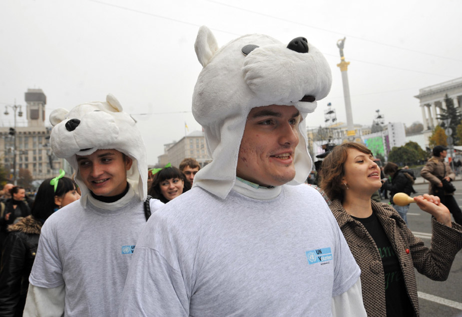2009年10月24日,當(dāng)日是350全球應(yīng)對(duì)氣候變化行動(dòng)日,世界各地的民眾紛紛用自己的方式來表示對(duì)全球氣候變化的關(guān)注和擔(dān)憂。圖為烏克蘭民眾組織的活動(dòng)。