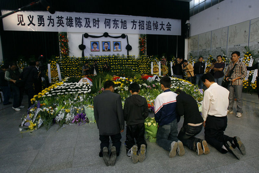 10月28日上午,湖北荊州市在市殯儀館舉行隆重追悼大會,悼念陳及時、何東旭、方招三位舍己救人大學生。數(shù)萬群眾趕到追悼會現(xiàn)場,手捧菊花為英雄道別。