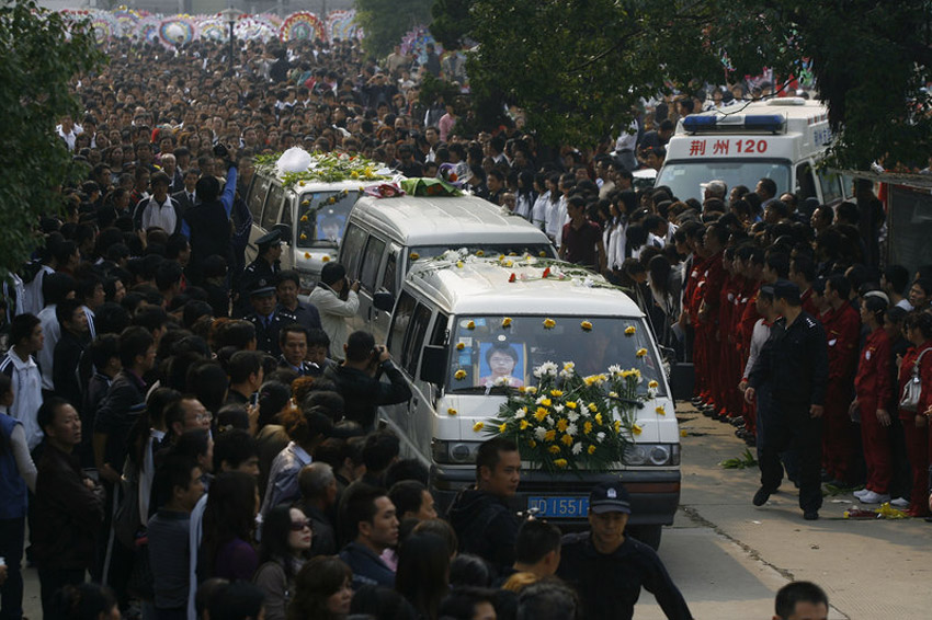 10月28日上午,湖北荊州市在市殯儀館舉行隆重追悼大會(huì),悼念陳及時(shí)、何東旭、方招三位舍己救人大學(xué)生。數(shù)萬(wàn)群眾趕到追悼會(huì)現(xiàn)場(chǎng),手捧菊花為英雄道別。