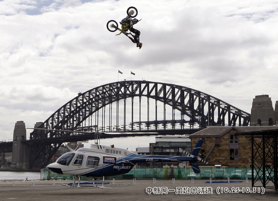 10月28日,在澳大利亞悉尼著名的港灣大橋附近,美國人特拉維斯·帕斯切拉駕駛摩托車成功從一架盤旋的直升機上空飛過。特拉維斯是一位著名的極限運動玩家,此次是為一個電視節(jié)目做推廣。>>點擊觀看詳細內(nèi)容