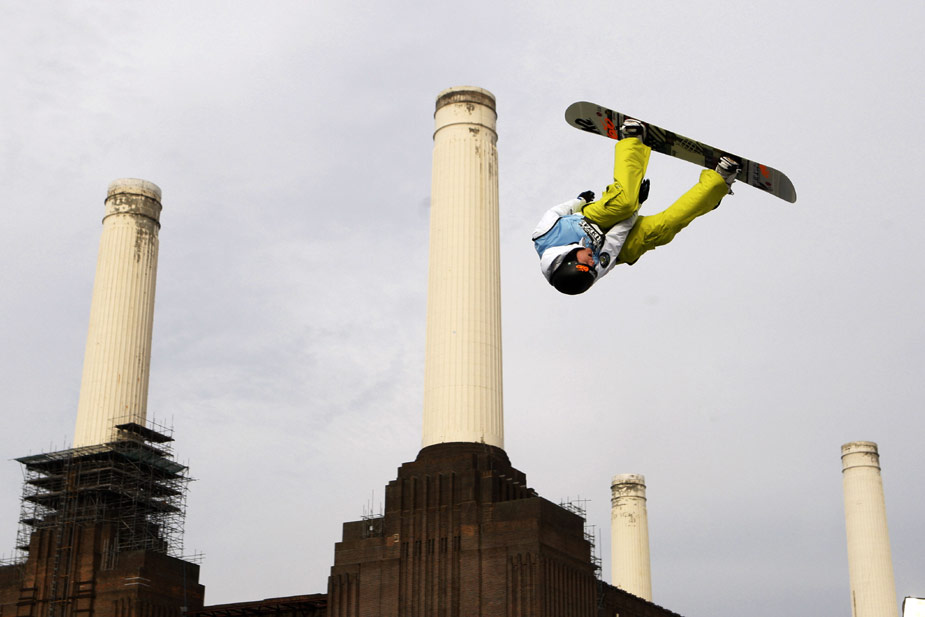 周五(30日),英國(guó)一位滑雪板高手在倫敦的一個(gè)電站前參加世界杯滑雪板比賽。 來源:中國(guó)新聞網(wǎng)