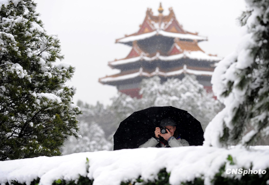 11月1日,深秋的北京大雪紛飛銀裝素裹,一名外國(guó)人在故宮角樓附近拍攝雪景。北京今年的初雪時(shí)間提前了整整一個(gè)月。中新社發(fā) 廖攀 攝