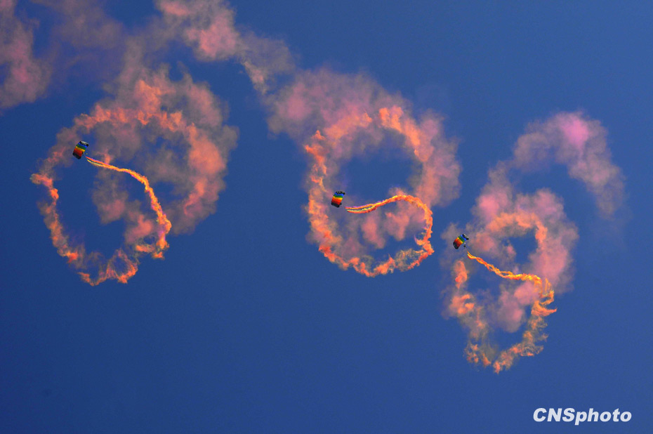 十一月三日,空軍八一飛行表演隊(duì)和空軍八一跳傘隊(duì)在北京沙河機(jī)場(chǎng)舉行預(yù)演,迎接十一月十一日中國人民解放軍空軍建軍六十周年。圖為空軍八一跳傘隊(duì)表演。中新社發(fā) 潘旭臨 攝