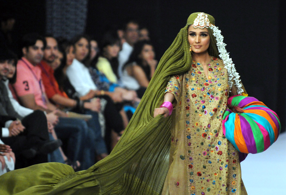 11月5日,巴基斯坦第一屆時(shí)裝周在卡拉奇拉開帷幕。美女模特們身著裸露雙肩和肚臍的非伊斯蘭傳統(tǒng)服裝在T臺上走秀。