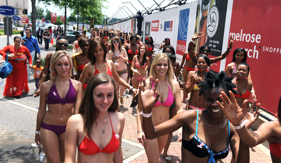 11月7日,南非女性著比基尼沿著梅爾羅斯門大道游行了1690米,在打破吉尼斯世界記錄的同時(shí)提醒婦女提高防范乳腺癌的意識(shí)。圖片來(lái)源:中國(guó)新聞網(wǎng)