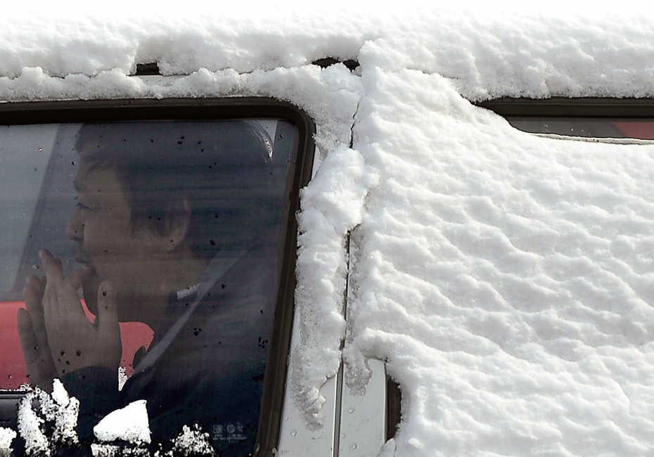 圖為一個(gè)人坐在大雪覆蓋的汽車內(nèi)。