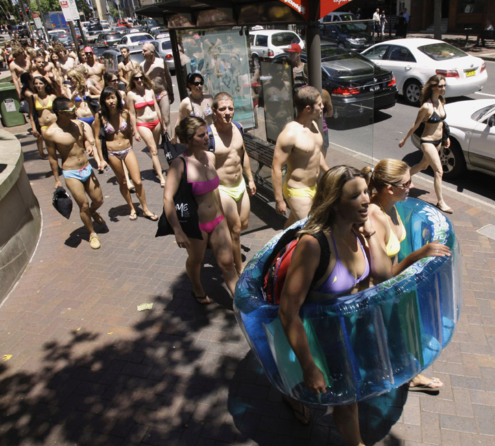 11月12日,約1000人身穿泳裝在悉尼街頭游行,欲打破287人近日在南非創(chuàng)造的最大規(guī)模泳裝游行的世界紀(jì)錄。