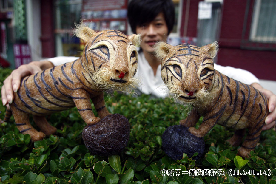 11月9日,北京一位時(shí)尚發(fā)型設(shè)計(jì)師正在展示頭發(fā)絲作品“福虎神威”賀歲虎年。這是祖國(guó)60華誕之后的又一新作,四川青年理發(fā)師黃鑫用2.6公斤碎頭發(fā)制作了一對(duì)可愛(ài)逼真的“;ⅰ保瑲v時(shí)兩個(gè)多月的時(shí)間才完工。>>點(diǎn)擊觀看詳細(xì)內(nèi)容