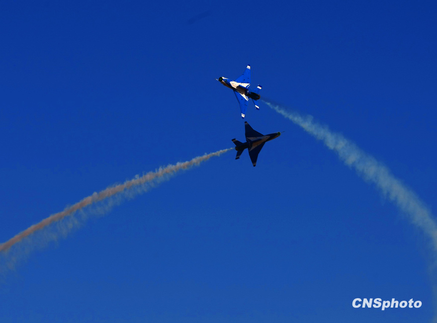 慶祝中國人民解放軍空軍成立60周年飛行表演,11月15日上午在北京沙河機場舉行。表演按八一飛行表演隊4架殲-10飛機表演12個動作和6架殲-7GB飛機表演15個動作,分四機對頭交叉、四機菱形隊大坡度盤旋、單機小速度平飛等27個動作,其中四機對頭交叉動作是這次表演中技術(shù)難度較大的動作之一,這是國產(chǎn)三代飛機和國產(chǎn)二代飛機首次同場競技表演。圖為殲-7GB進行表演。中新社發(fā) 宋吉河 攝