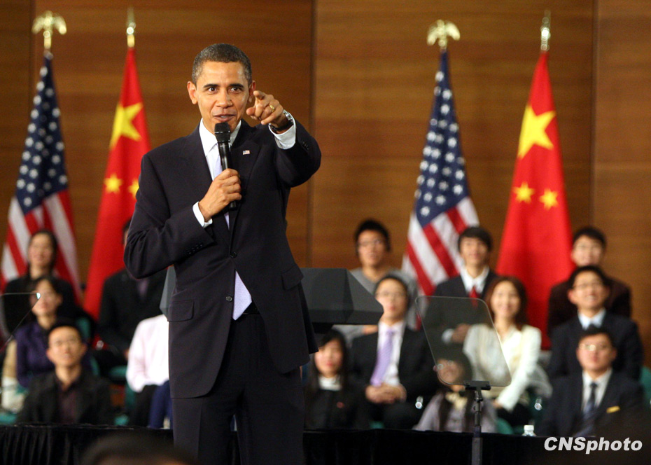 11月16日,正在上海訪問的美國總統(tǒng)奧巴馬現(xiàn)身位于浦東的上海科技館,與四百余中國青年進(jìn)行面對面交流。 中新社發(fā) 湯彥俊 攝