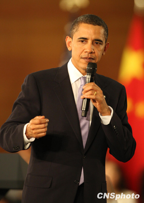 11月16日,正在中國(guó)進(jìn)行國(guó)事訪問的美國(guó)總統(tǒng)奧巴馬,在上海就中美關(guān)系的未來發(fā)表演講。中新社發(fā) 湯彥俊 攝