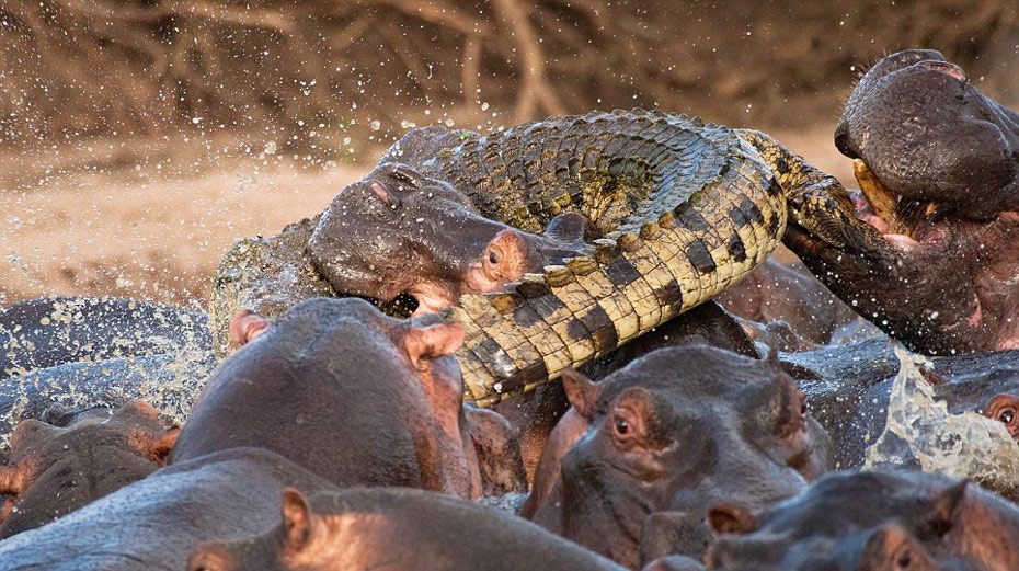 一條鱷魚悄悄混入了正在河里洗澡的河馬中,它很快就被敏感的母河馬發(fā)現(xiàn)。憤怒的河馬們立刻對(duì)它發(fā)起了猛烈地攻擊,這條冒失的鱷魚很快死于非命。