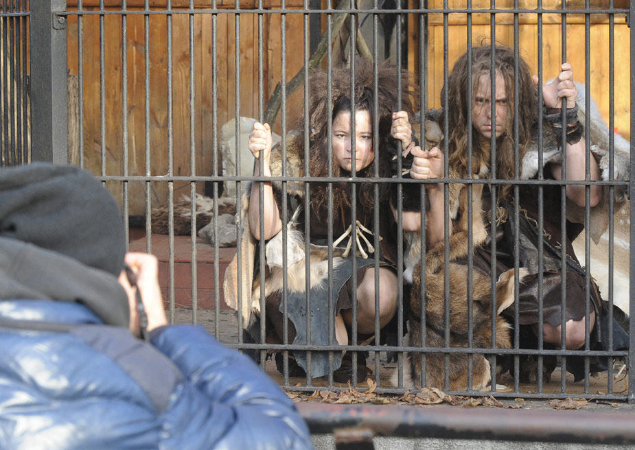 11月27日,波蘭首都華沙動(dòng)物園里,一男一女兩個(gè)志愿者扮成原始洞穴人向參觀者進(jìn)行展示。該動(dòng)物園想通過(guò)這項(xiàng)為期一周的活動(dòng),提醒參觀者注意人類也是動(dòng)物界的一部分。
