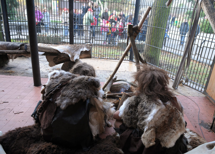 11月27日,波蘭首都華沙動物園里,一男一女兩個志愿者扮成原始洞穴人向參觀者進行展示。圖片來源:中國新聞網(wǎng)