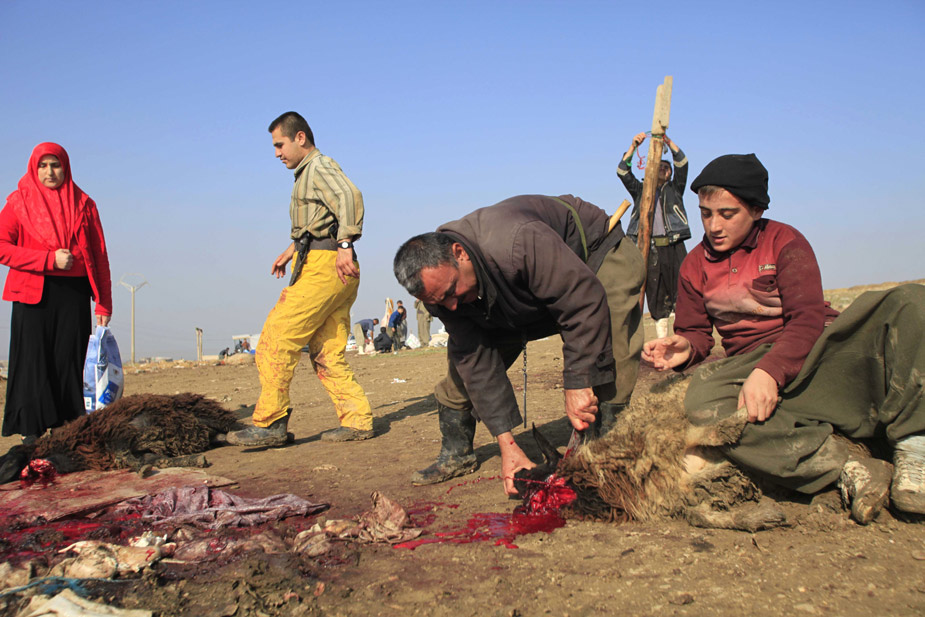 11月28日,世界各國的穆斯林迎來傳統(tǒng)節(jié)日“宰牲節(jié)”。圖為伊拉克的穆斯林在宰牲節(jié)上宰殺牲畜。