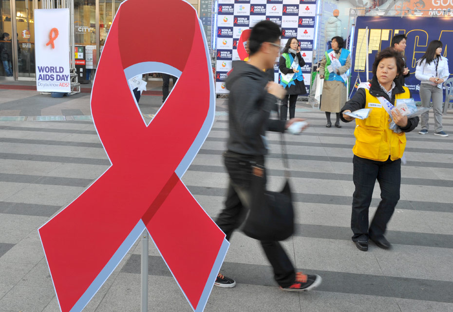 11月30日,韓國(guó)首爾,紅十字會(huì)工作人員在街頭放置紅絲帶標(biāo)識(shí)宣傳世界艾滋病日。12月1日是世界艾滋病日,2009年世界艾滋病日的主題是“普遍可及和人權(quán)”。世界各地民眾組織各種活動(dòng)呼吁人們關(guān)注艾滋病。圖片來(lái)源:中國(guó)新聞網(wǎng)