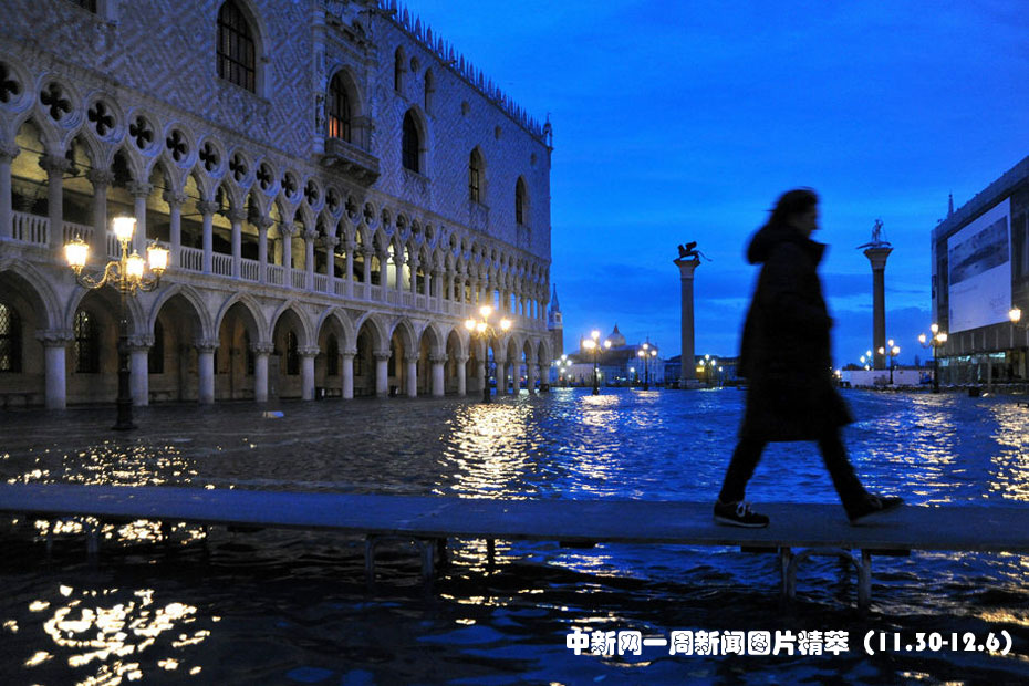 11月30日,意大利水城威尼斯受潮汐和一股強(qiáng)烈的熱帶風(fēng)暴影響再次被洪水淹沒,部分地區(qū)最高水位達(dá)到1.31米。圖片來源:中國新聞網(wǎng)