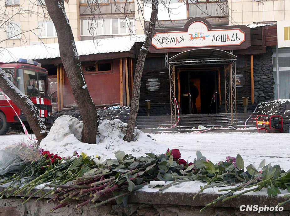 十二月六日,俄羅斯彼爾姆市民眾自發(fā)來(lái)到夜總會(huì)火災(zāi)事故現(xiàn)場(chǎng),悼念遇難者。圖中紅色建筑即為失火夜總會(huì)。中新社發(fā) 田冰 攝