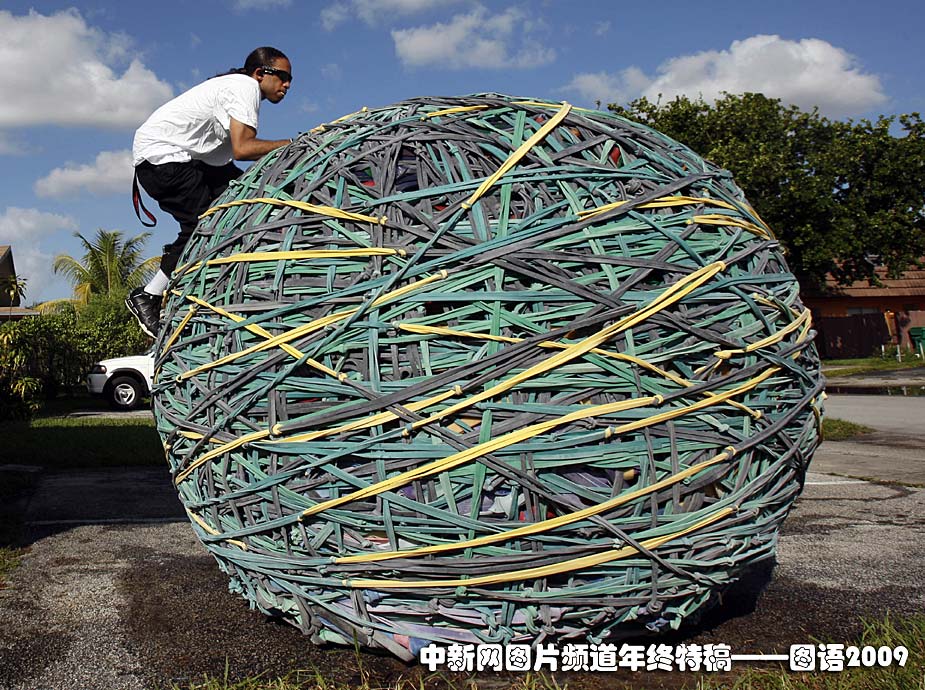 世界最大的橡皮筋球:10月23日,美國佛羅里達州青年喬爾終于完成了他的作品——世界上最大的橡皮筋球。圖片來源:中國新聞網(wǎng)