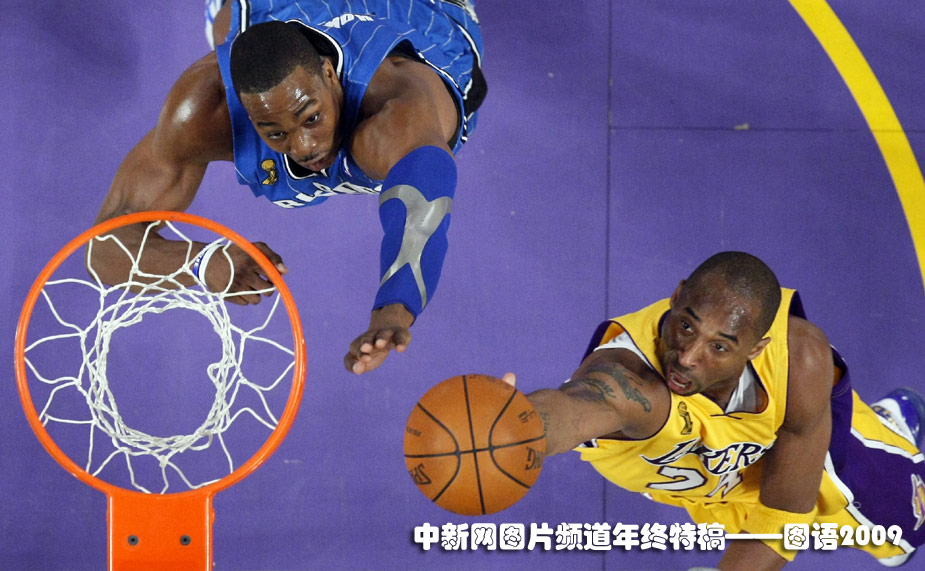 6月5日,NBA總決賽洛杉磯湖人隊(duì)迎戰(zhàn)奧蘭多魔術(shù)隊(duì),兩隊(duì)當(dāng)家球星科比布萊恩特與“魔獸”霍華德在籃下“斗法”。