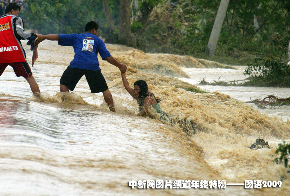 10月9日,在菲律賓北部,幾位民眾正在營(yíng)救陷入洪水的婦女。
