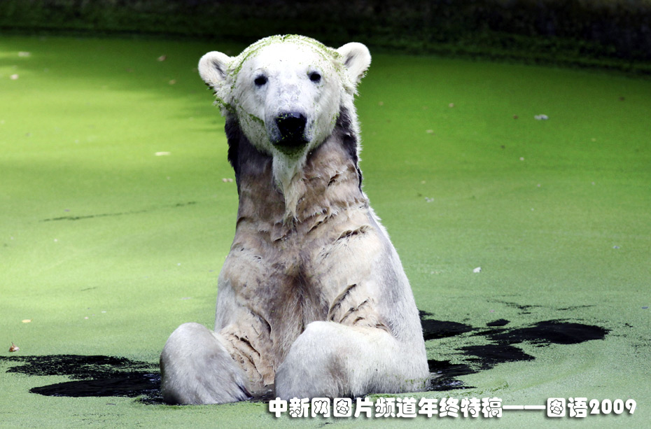 德國(guó)柏林動(dòng)物園的明星北極熊克努特正在水中“自?shī)首詷?lè)”。
