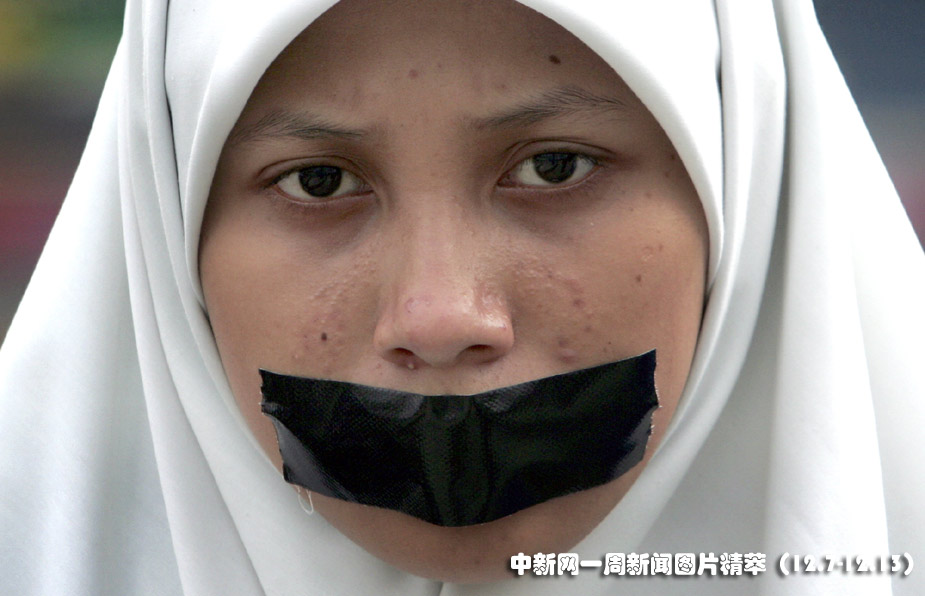 9日(周三),印尼首都雅加達(dá),一位婦女嘴上貼著黑色膠布,參加反腐示威游行。圖片來源:中國新聞網(wǎng)
