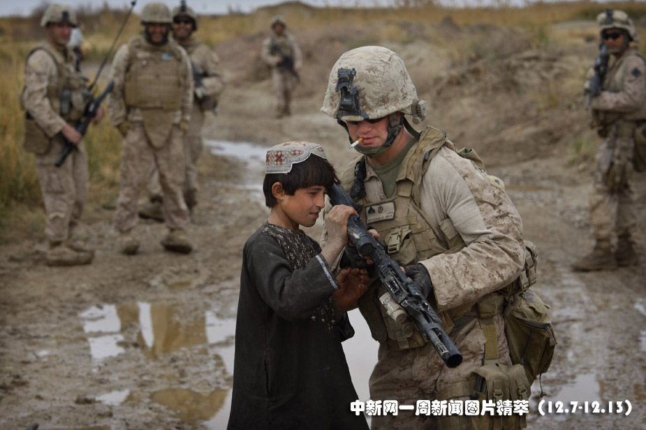 10日(周四),阿富汗,一名美軍士兵正在向一位當?shù)啬泻⒄故舅奈淦。圖片來源:中國新聞網