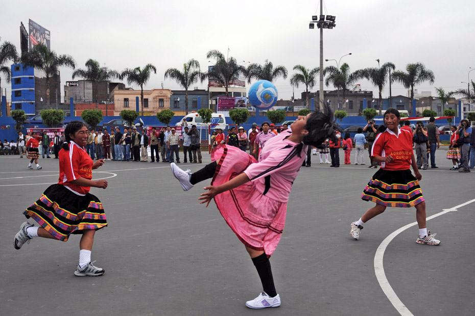 12月12日,秘魯印第安婦女在利馬國(guó)家體育場(chǎng)外舉辦了一場(chǎng)特別的足球賽,所有的球員均身著傳統(tǒng)服飾光腳上陣妙趣橫生。圖片來(lái)源:中國(guó)新聞網(wǎng)