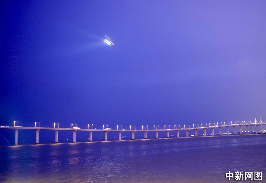 直升機(jī)飛過澳門友誼大橋。中新社記者 廖攀 攝