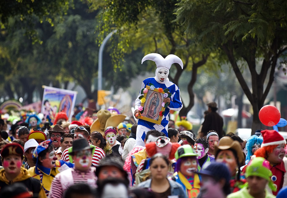12月16日,墨西哥小丑們聚集在首都墨西哥城參加街頭游行活動(dòng),700多名小丑用自己五彩斑斕的服飾和滑稽可笑的表演為沿途的人們帶來(lái)歡笑。圖片來(lái)源:中國(guó)新聞網(wǎng)