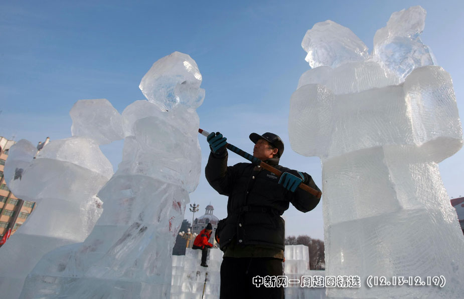 12月16日,新疆烏魯木齊市人民廣場,兩位冰雕師傅正在抓緊時間雕刻一組表現(xiàn)新疆少數(shù)民族風(fēng)情的大型冰雕作品。圖片來源:中國新聞網(wǎng)>>點擊觀看詳細(xì)內(nèi)容