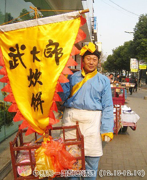 12月18日,46歲的山東省陽谷縣李振生,身著青衣襟、白圍裙、黃頭巾,肩挑貨擔(dān)裝扮成武大郎的模樣在南京街頭走街串巷賣炊餅。圖片來源:中國新聞網(wǎng)>>點擊觀看詳細內(nèi)容