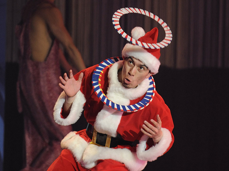 12月19日,在日本東京一家劇院,身著圣誕老人服裝的退役的奧運會選手參加“肌肉音樂劇”預演,展示其過人的身體素質(zhì)與運動技巧。圖片來源:中國新聞網(wǎng)