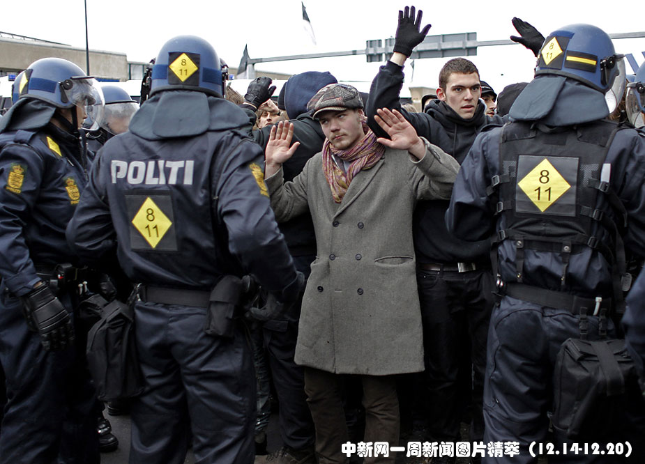 13日(周日),哥本哈根警方扣留了一群示威者。聯(lián)合國氣候變化大會正在當?shù)卣匍_。圖片來源:中國新聞網(wǎng)