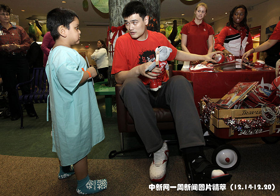 14日(周一),美國休斯敦,姚明和幾位休斯敦火箭的隊友來到一家兒童醫(yī)院看望患兒,并為孩子們送去禮物。圖片來源:中國新聞網