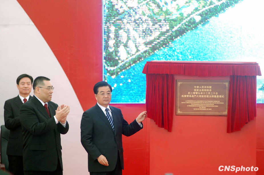 12月20日下午,國(guó)家主席胡錦濤在澳門(mén)第三任行政長(zhǎng)官崔世安陪同下出席珠海橫琴島澳門(mén)大學(xué)新校區(qū)奠基儀式。中新社發(fā) 畢永光 攝