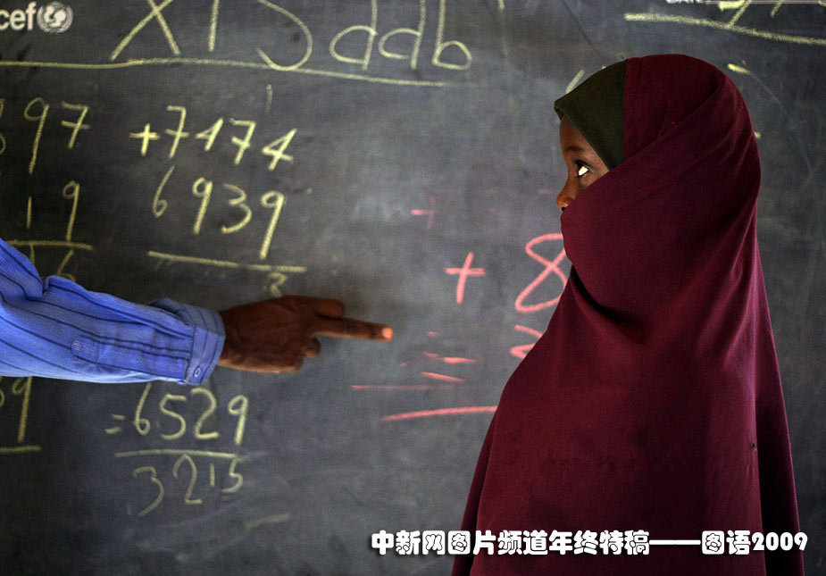 2009年6月15日,一位流離失所的女孩在索馬里的一個(gè)難民營(yíng)內(nèi)上課。