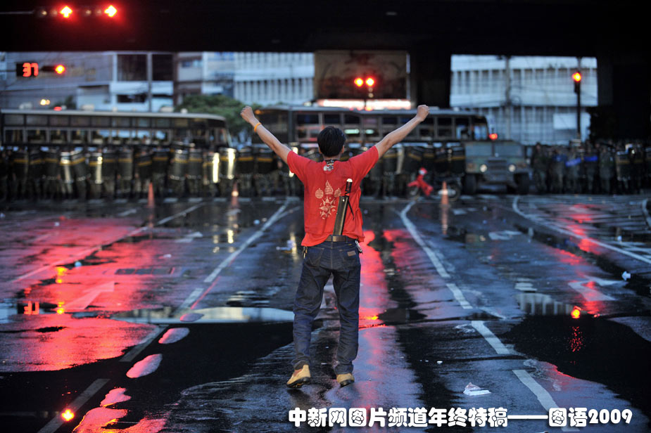 2009年4月13日,一位泰國(guó)總理他信的支持者在曼谷街頭和軍警對(duì)峙。