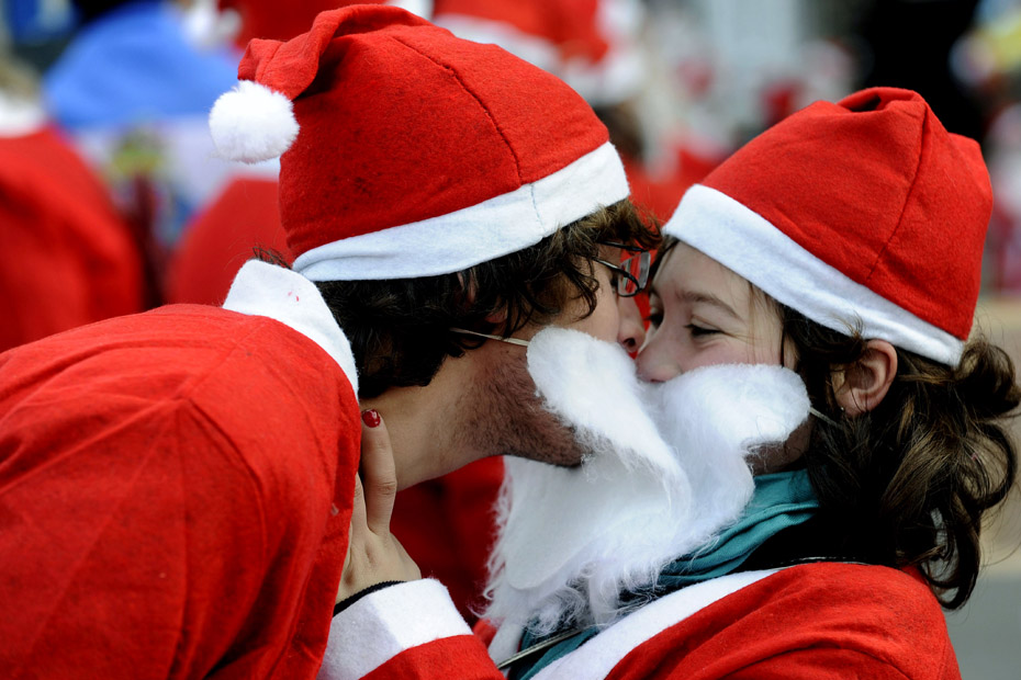 圖為波爾圖街頭的一對夫婦打扮成圣誕老人在圣誕游行中接吻。