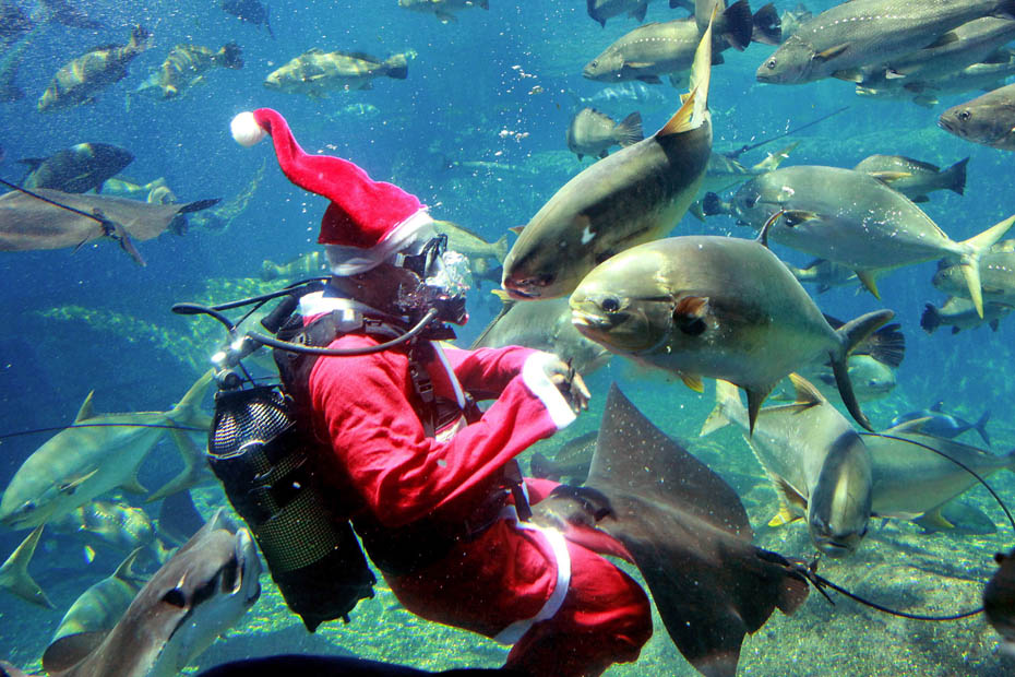 圖為迪拜海底世界主題公園內(nèi)一個身著圣誕老人服裝的飼養(yǎng)員在水中喂食。