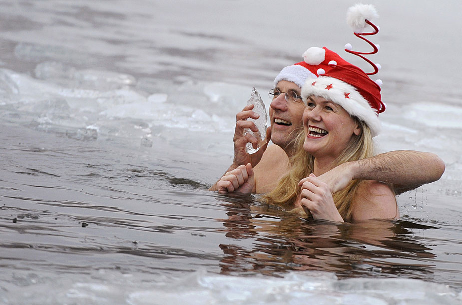 12月25日,德國柏林的冬泳俱樂部“柏林海豹”(Berliner Seehunde)的成員不畏寒冬,光著身子在已經結冰的Oranke湖中暢游一番。圖片來源:中國新聞網